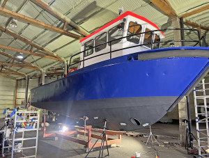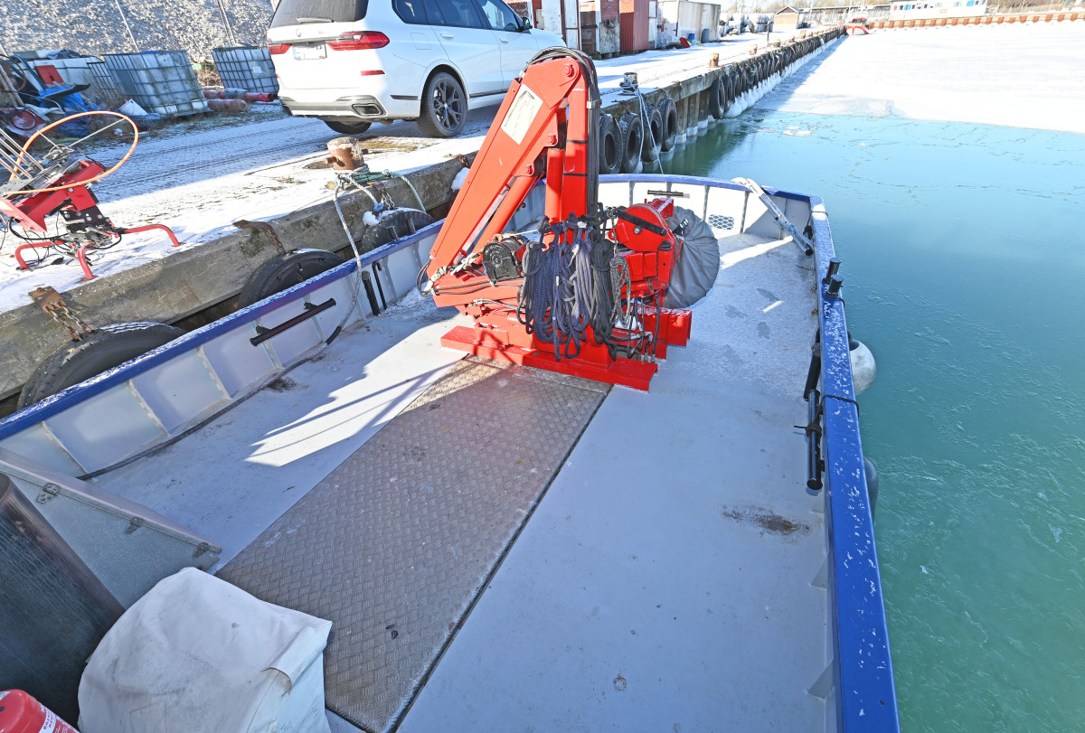 On the aft deck there is an HMF HYFA crane with a lifting capacity of 665 kg at 6 m outreach, towing hook, and a cargo hold or storage space below deck.