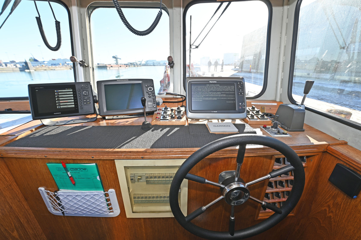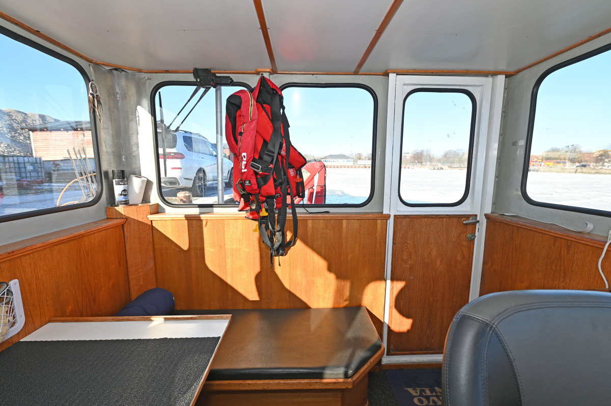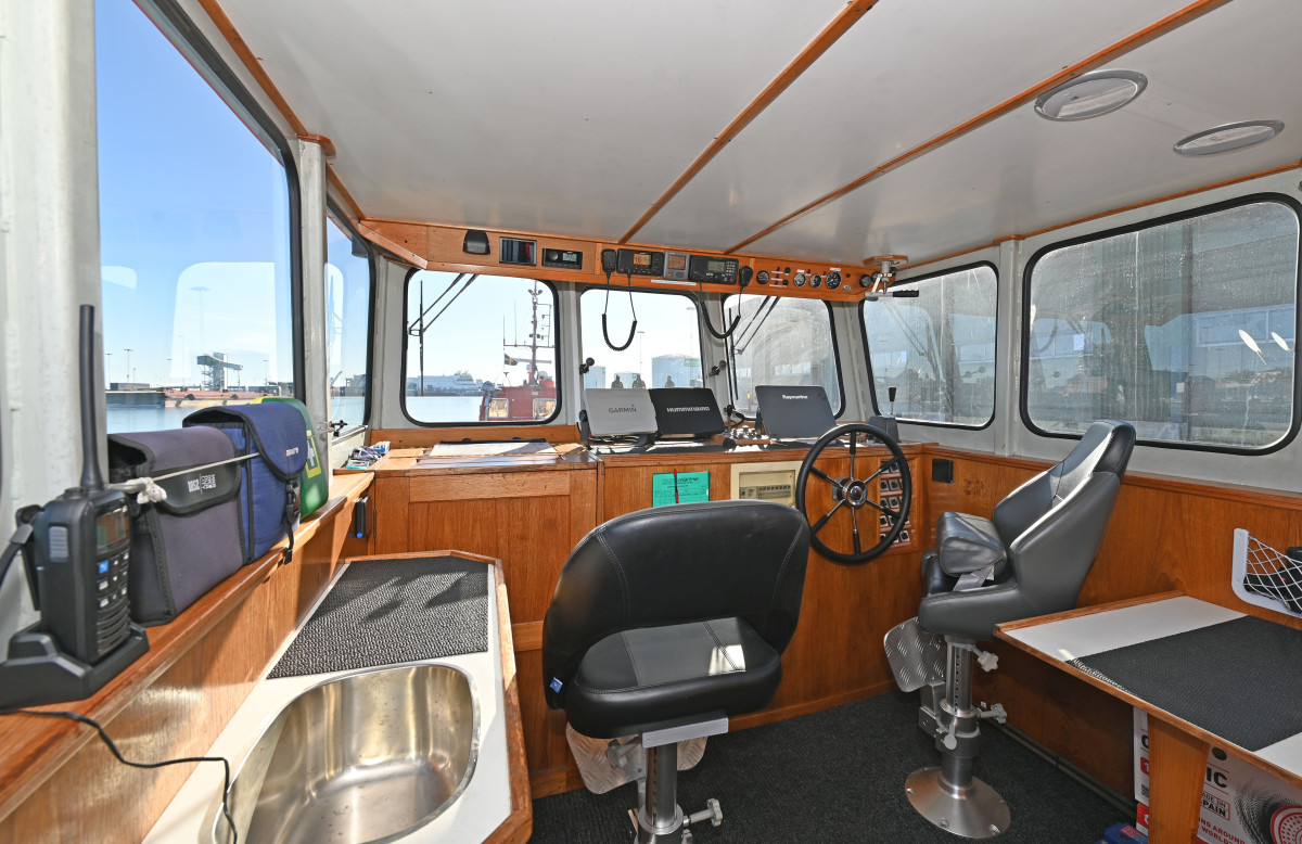 Modern navigation equipment. The wheelhouse is fitted with two seats, a small sofa with table, and a compact galley. Below deck there is one cabin with two berths and a toilet.