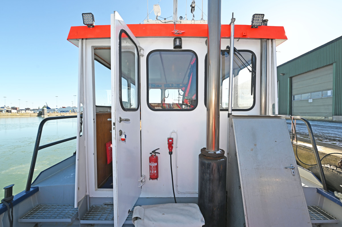 Unregistered small tug/workboat, built in steel, with aft deck and crane. Dimensions 11.8 x 3.8 m with a draft of just under 1.5 m. Previously owned by the Port of Trelleborg.