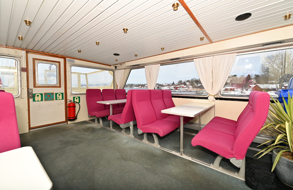 Salong huvuddäck. 67 stolar med tillhörande bord. Baggageförvaring i fören och bar/café, samt toaletter i aktern.