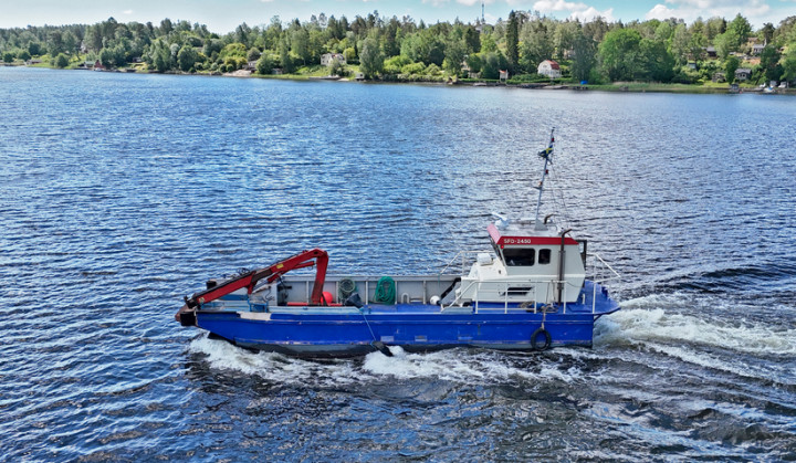 Work boat of approx. 12 x 4 meters, probably built in Sweden in 1990. Stand-up hull. The boat is equipped with two Volvo TAMD 41P engines, installed in 2015, which are accessible via hatches on deck.