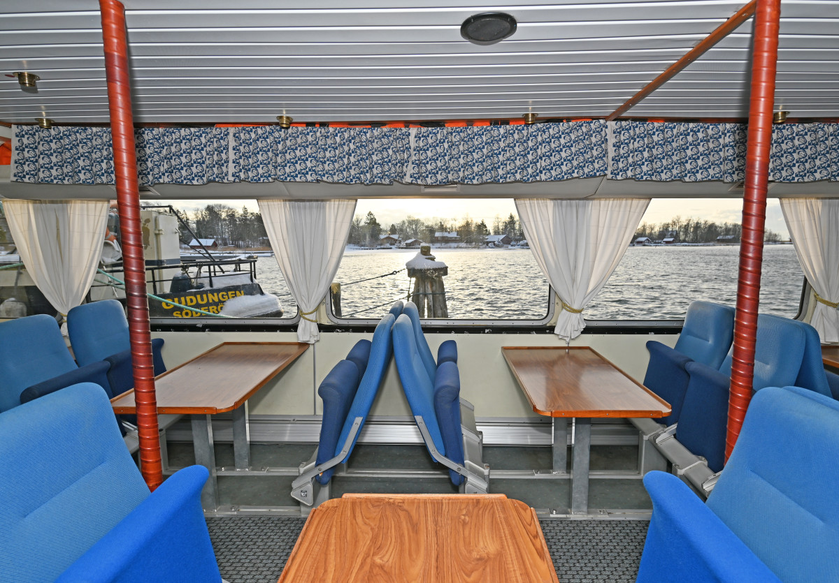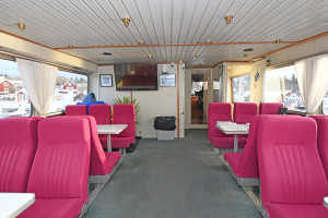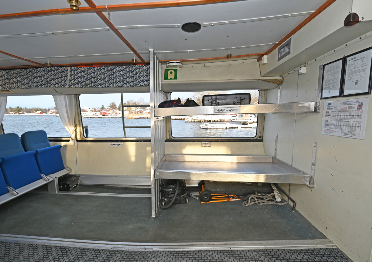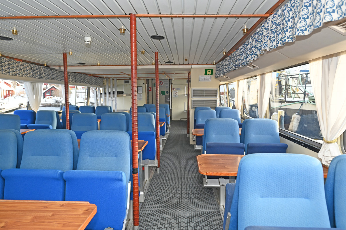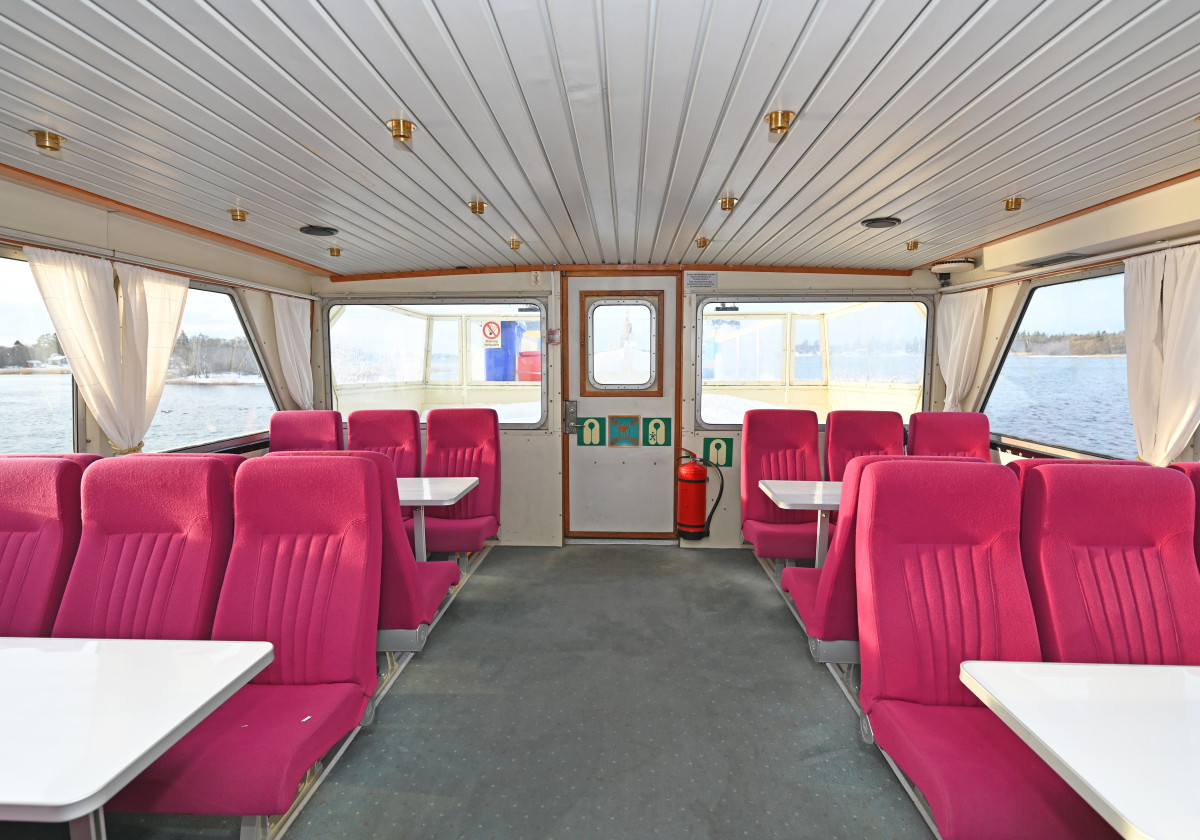 Salong huvuddäck. 67 stolar med tillhörande bord. Baggageförvaring i fören och bar/café, samt toaletter i aktern.