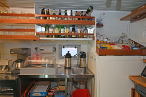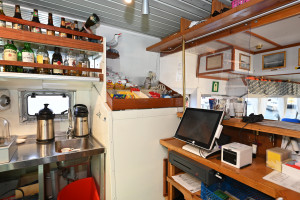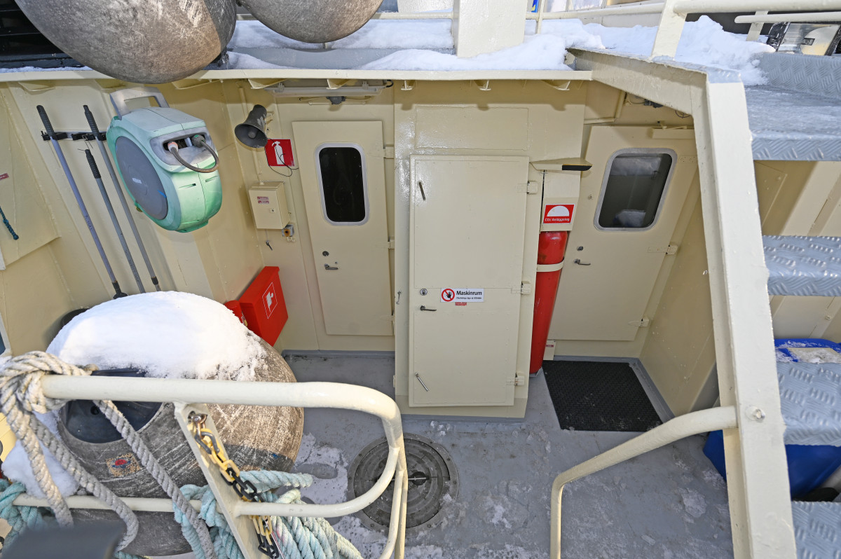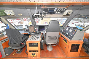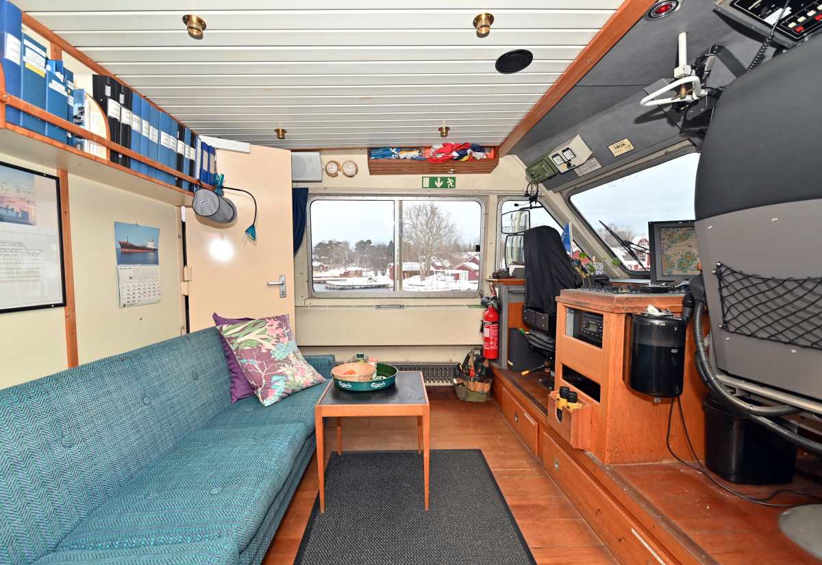 Styrhytt. Rymilg styrhytt med soffa och mindre kontorsplats. Utrustad med två Furunoradar och GMDSS radio. Personaltoalett i anslutning.