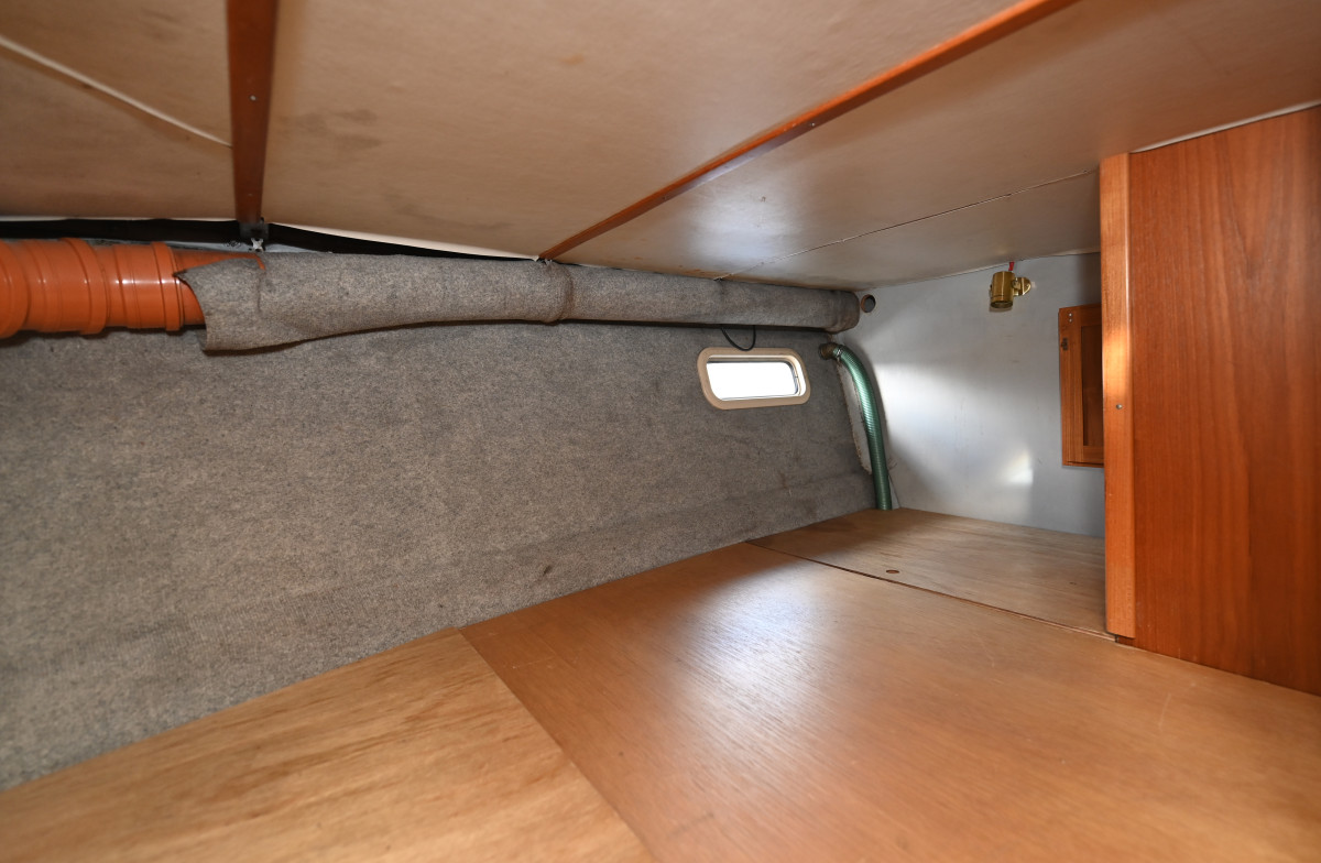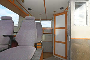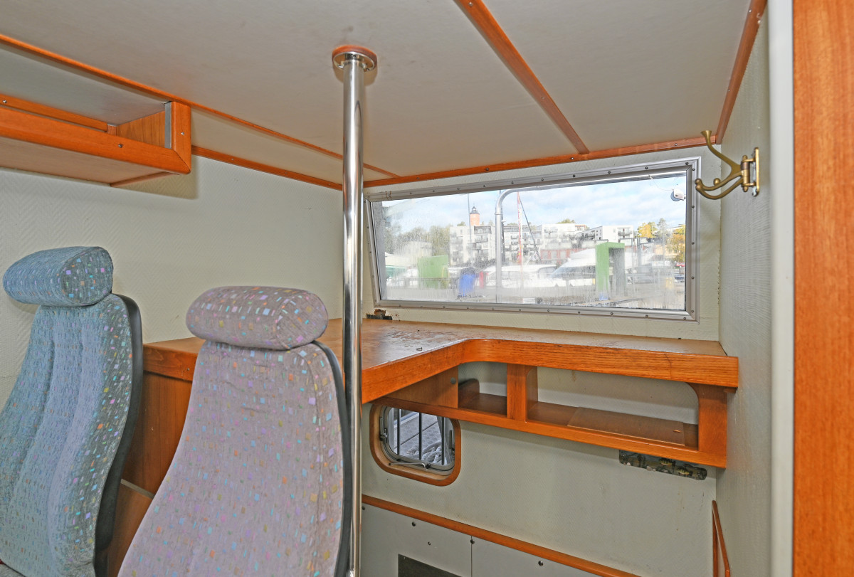 I för och akter finns rymliga stuvutrymmen samt stickkojer. Fungerande toalett. Utöver förarstol och navigatörstol finns ytterligare fyra passagerarstolar.