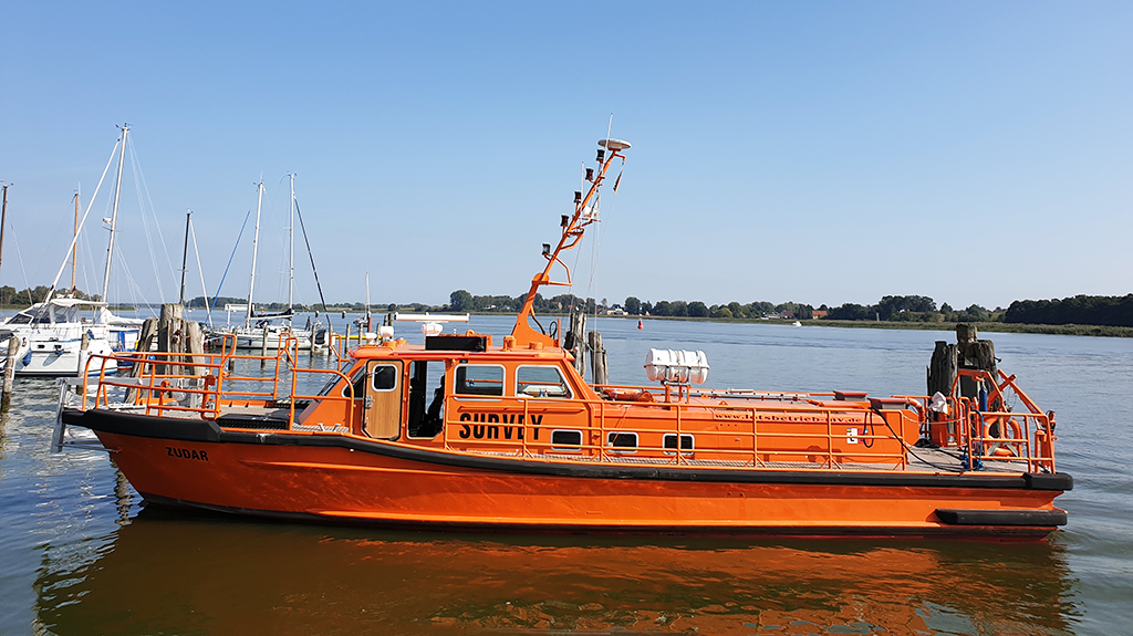 Mycket välskött surveybåt i aluminium med dubbla Mercedes OM 404-maskiner. Byggd på Ostsee-Werft, Tyskland, 1979. Ca 22 knops toppfart och ca 20 knops marschfart. 17.22 m x 4.10 m. LR klass.