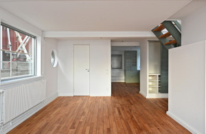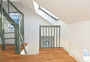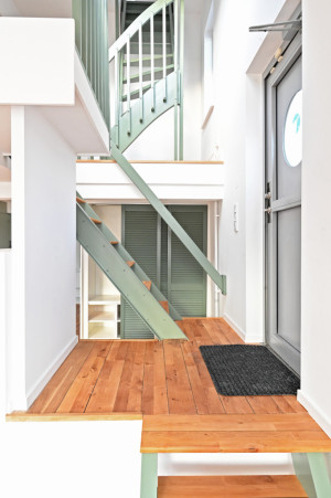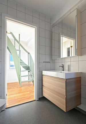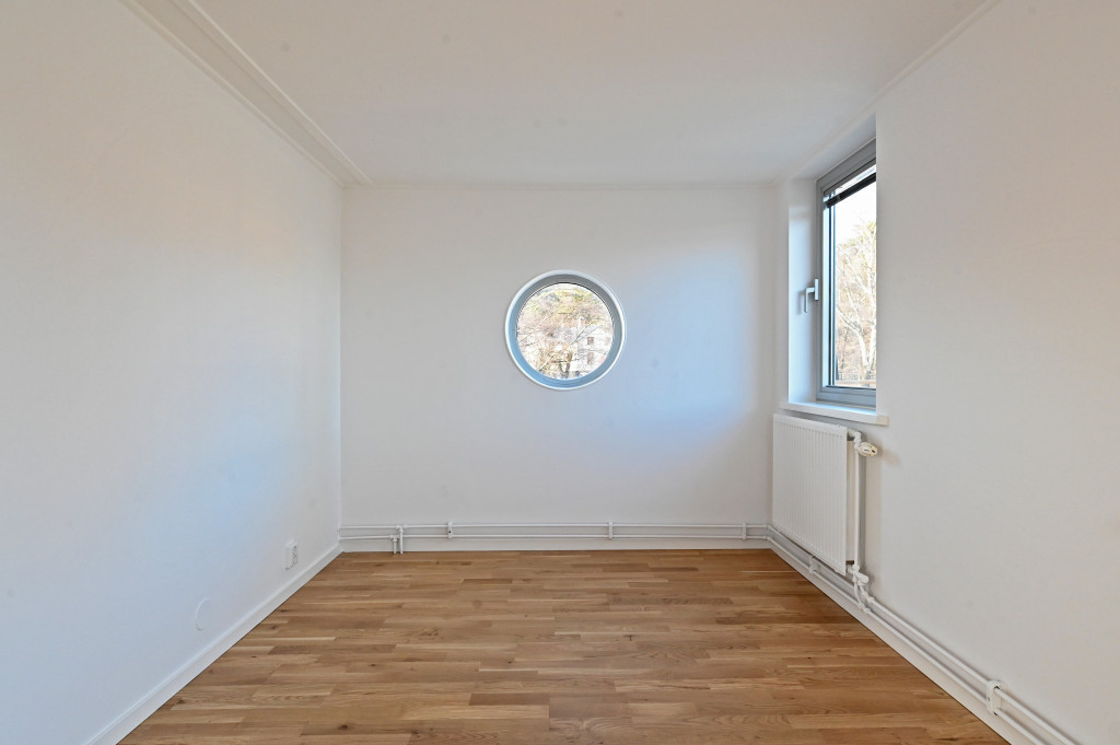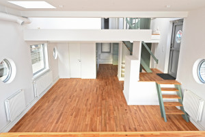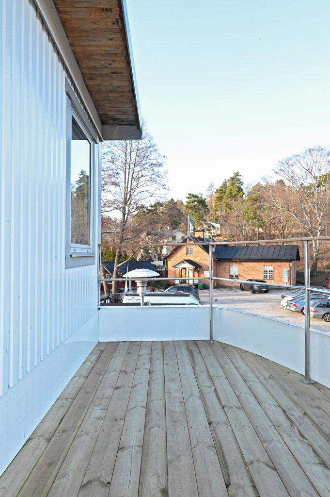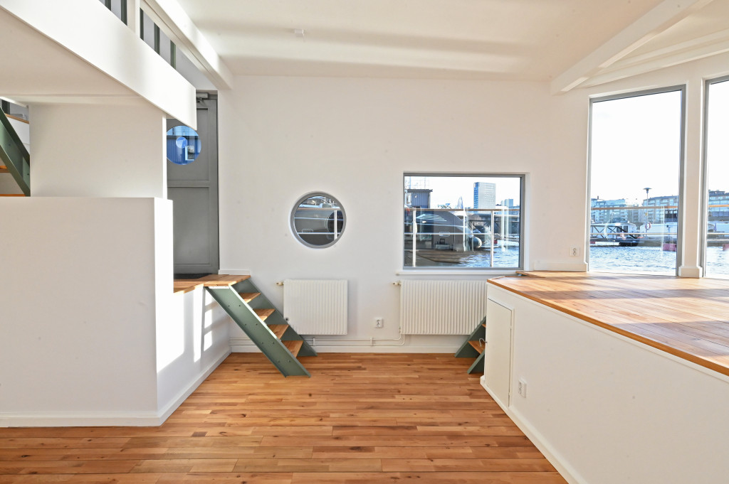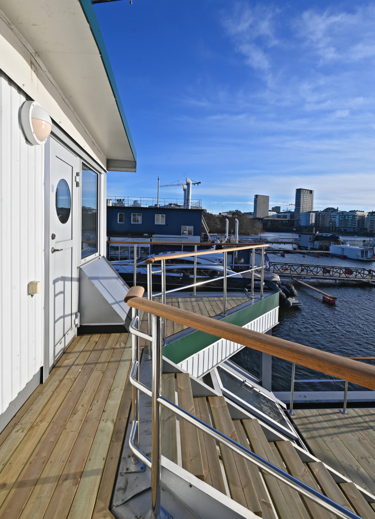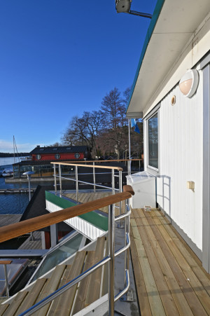 Andra våningen. Entré (möjligt sovrum) från akterdäck, toalett med badkar, trapphall med takfönster.